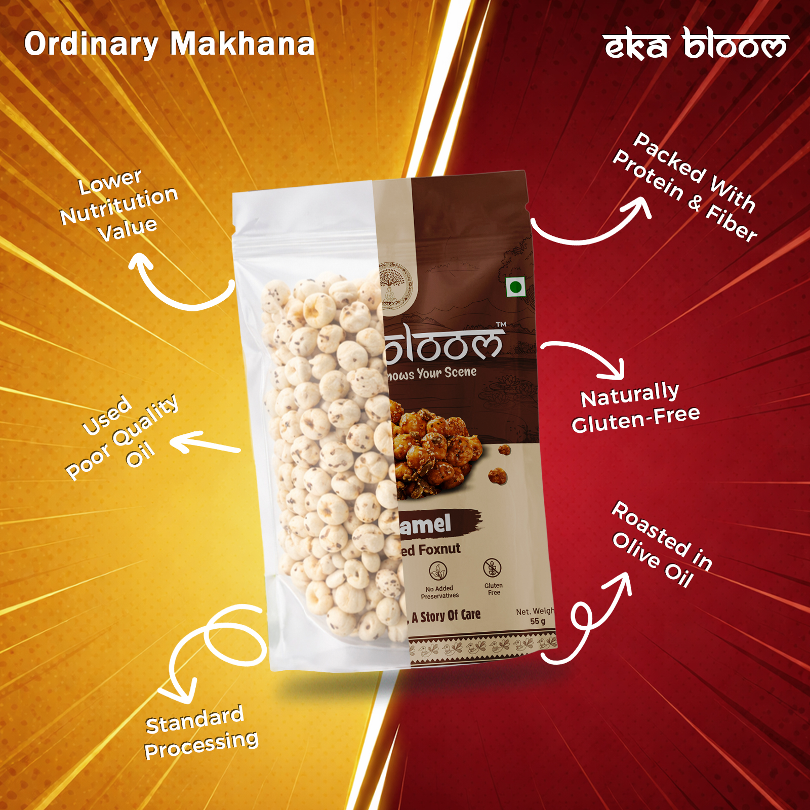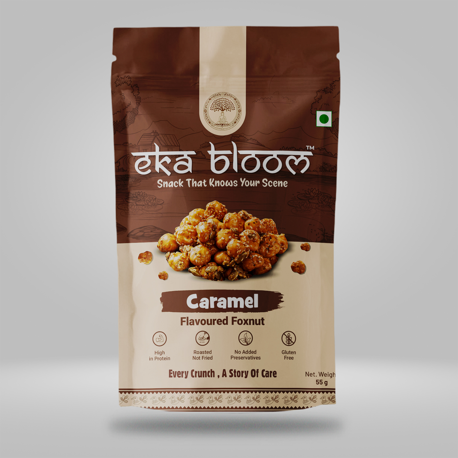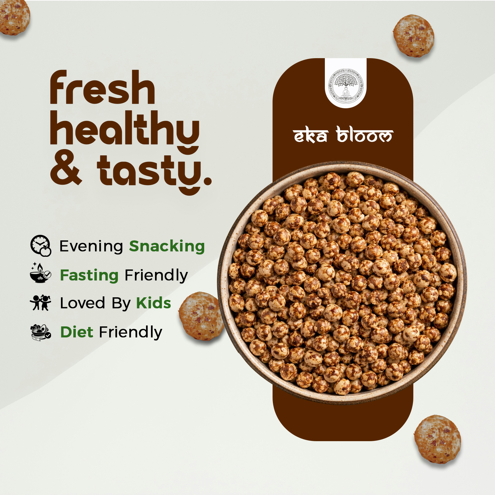 Light caramel glaze over roasted makhana, perfect for healthy dessert cravings.